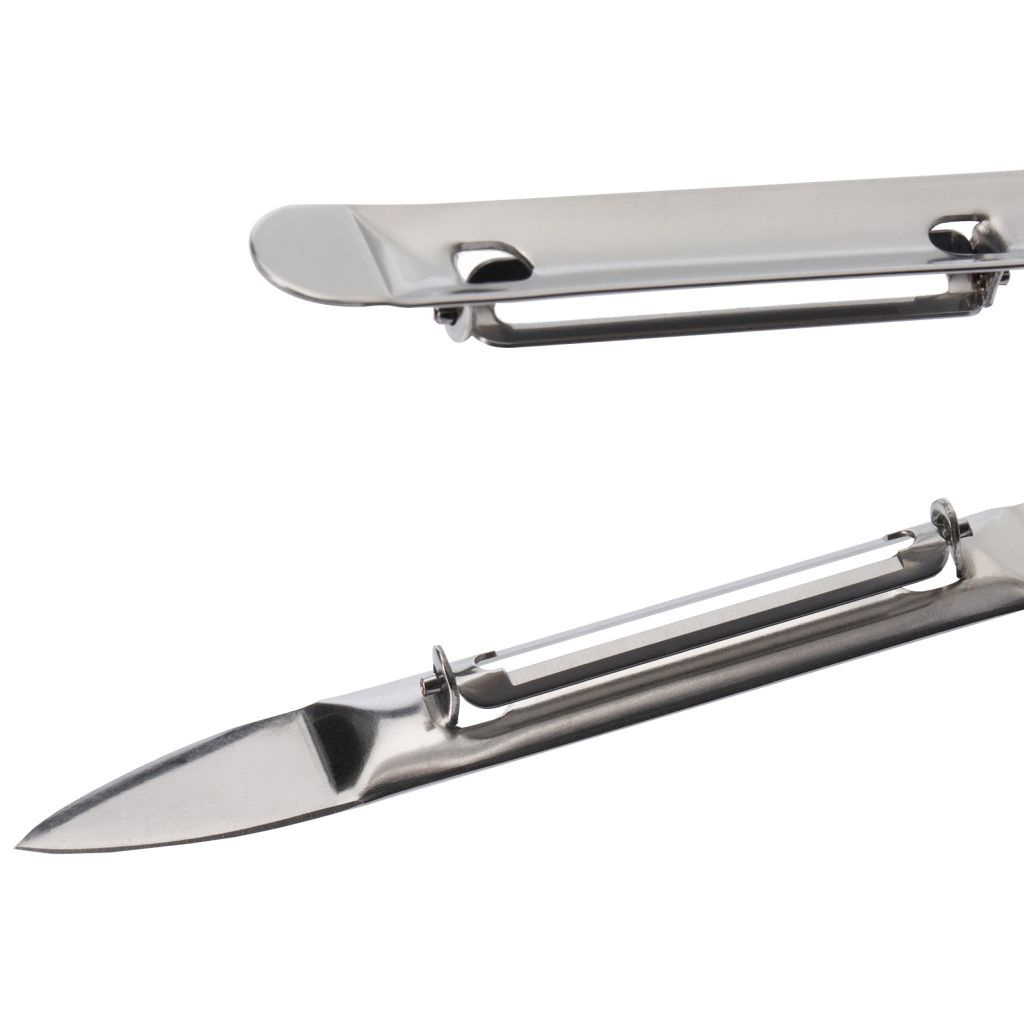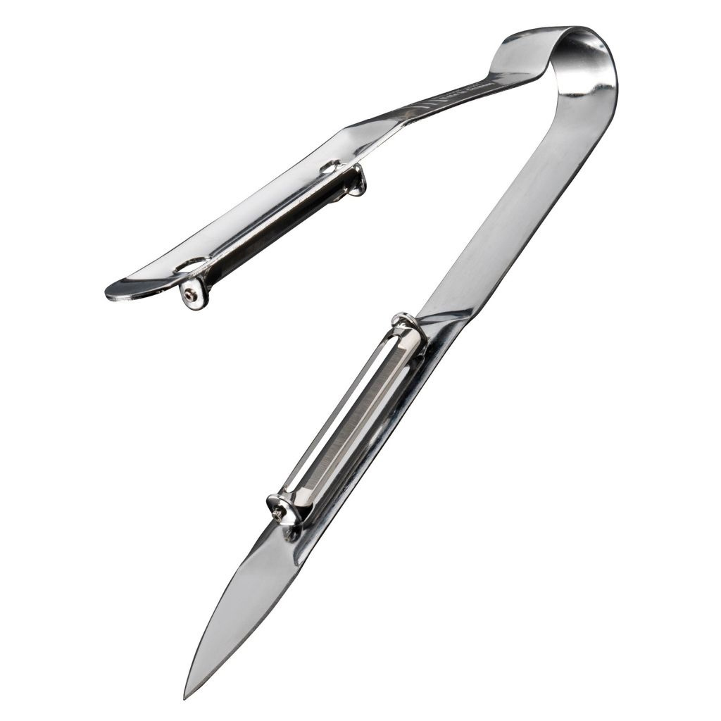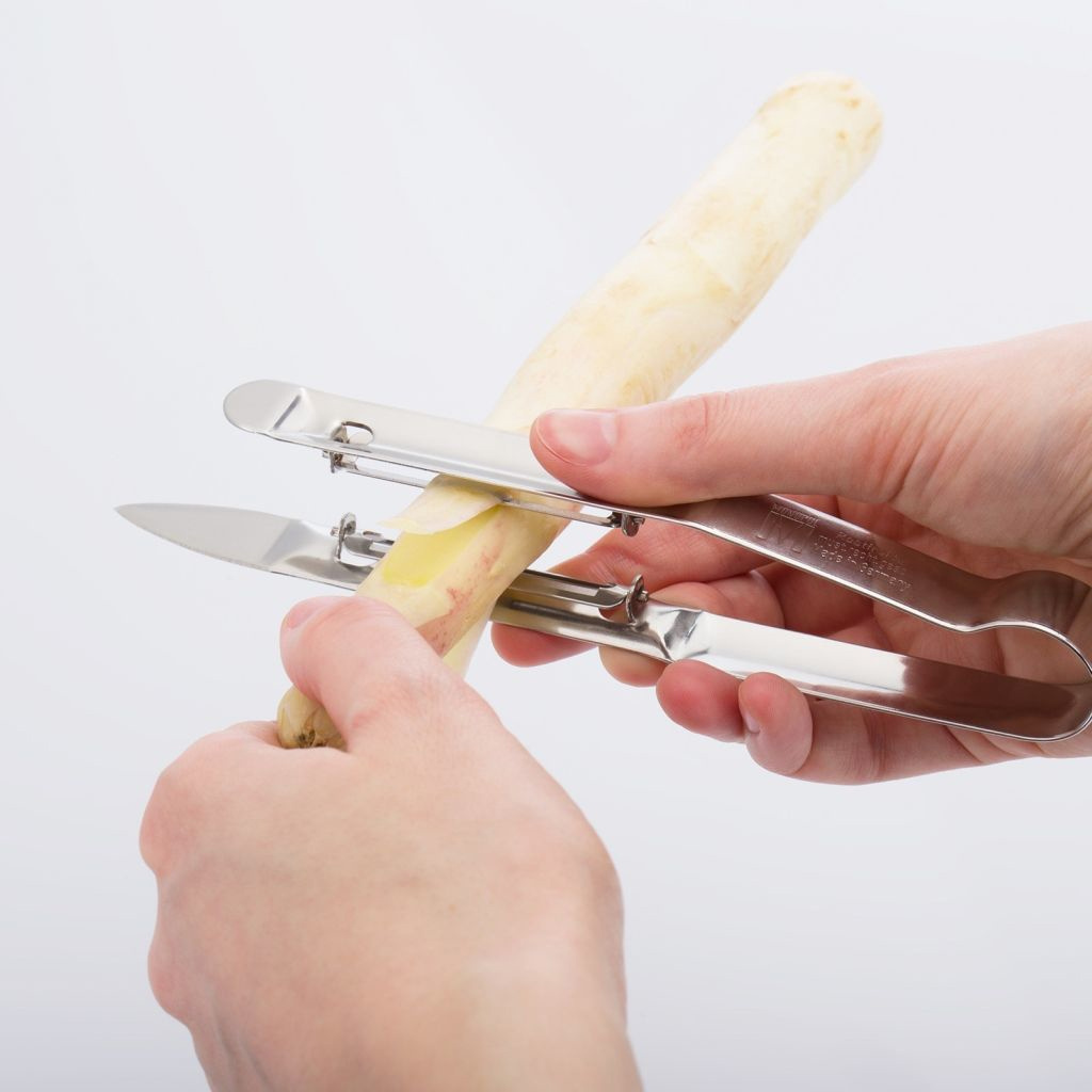 Aspargesskrelleren fra Westmark er fra den høykvalitets ""Monopol Edition"". Som aspargesskreller er den utstyrt med to motstående kniver og skreller de lange grønnsakene dobbelt så raskt. De to bevegelige bladene tilpasser seg aspargesens konturer, og det slipte bladet skiller endene av aspargesen enkelt og raskt. Når den brukes på asparges, motvirker det andre bladet det møre aspargesrøret slik at grønnsaken ikke knekker. Du får taket på det etter bare noen få minutter, og den doble skrelleren vil glede deg med sin effektivitet. Skreller og blad er laget av rustfritt stål av høy kvalitet.