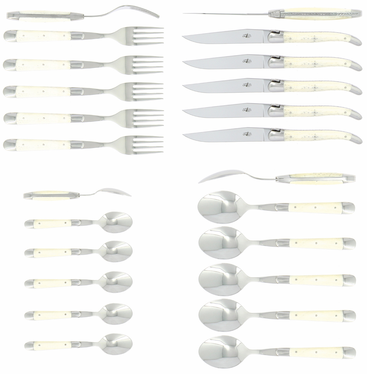 Bestikksettet inneholder 24 deler, seks gafler, seks kniver, seks spiseskjeer og seks dessertskjeer. Alt leveres i en like håndlaget eikeeske som er perfekt til oppbevaring. Håndtakene er laget av oksebein (opprinnelse Frankrike).