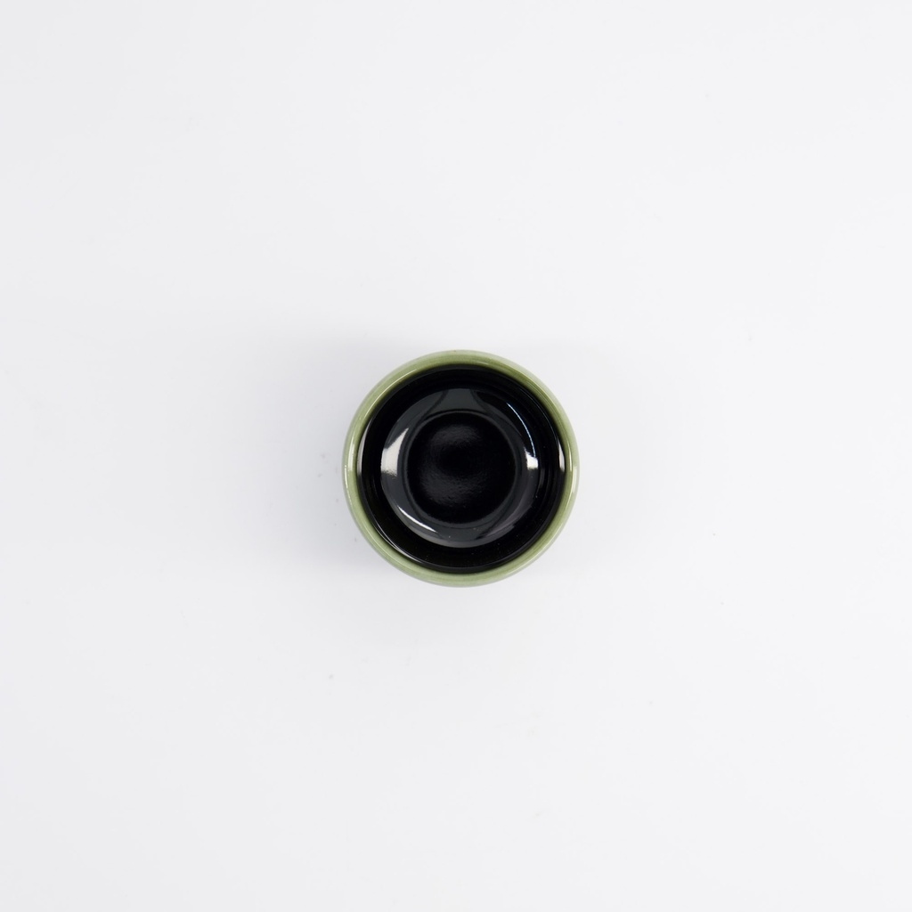 Denne modellen er laget av keramikk med en dypgrønn glasur og en rustikk, lett prikket fot som lar leiren skinne gjennom. Fargen minner om matcha og mørk jade, og får frem varmen i drikken når lyset fanger den tynne glasuren.