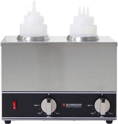 En flaskevarmer for kjøkken som serverer varme sauser, emulsjoner eller oljer direkte fra dressingflaske under service. Schneiders elektriske modell varmer uten vannbad: flasken sitter i et omsluttende rom som holder temperaturen via direktkontakt og varm luft, noe som betyr at det ikke er noe vann å bytte, ingen rust og minimal vedlikehold mellom vakter. Temperaturen er trinnløst justerbar mellom 40 og 90°C, og dekker alt fra en serveringstemperert beurre blanc til en sterk chilipynt uten å risikere overoppheting av sensitive emulsjoner.