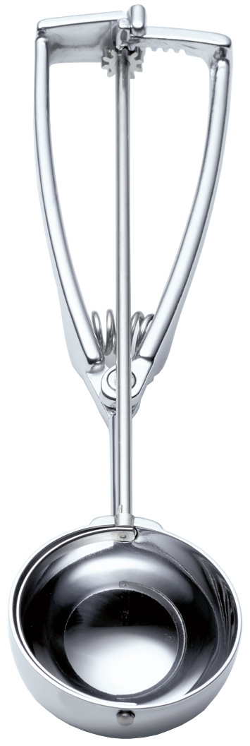 Model CR har en tydelig, noe dypere kupa enn mange lettere alternativer. Det gjør at den arbeider rent gjennom både faste og mykere masser uten å deformere formen. Den stive konstruksjonen gir jevnt trykk gjennom hele bevegelsen, særlig merkbart i tett iskrem, kald farse eller kompakt puré. Forskjellen merkes fra første øse og enda mer etter tusenvis av repetisjoner.