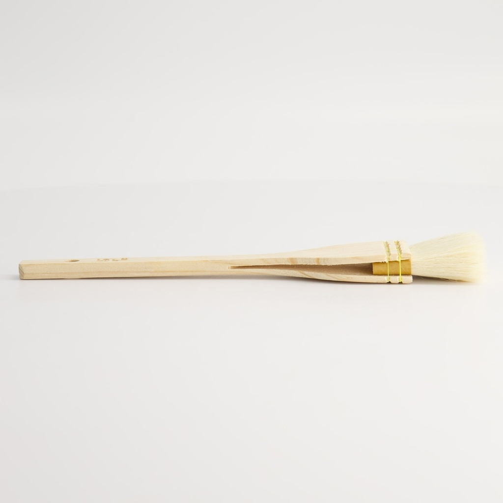 En klassisk japansk kokekost, uchiwa bashi, laget av håndbundet geitebust og et ubehandlet trehåndtak. Den brukes tradisjonelt til å pensle tare (saus) på grillspyd som yakitori eller kushiyaki, men fungerer like godt til glasering, oljing av støpejern eller baking.