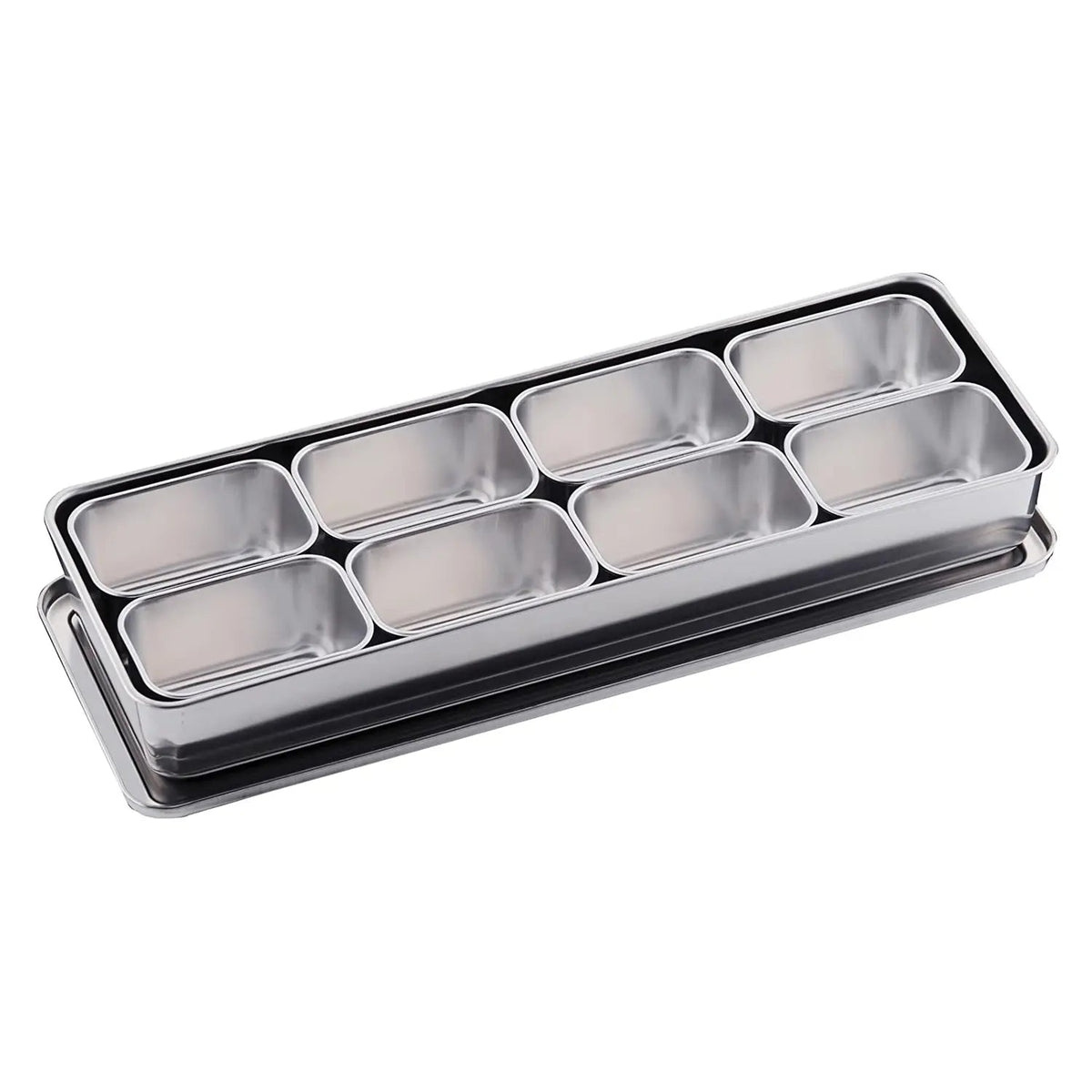 Kjekk brett i rustfritt stål for å holde kantiner til mise en place. Brettet leveres med lokk, men uten tilhørende kantiner. Du kan sette sammen din perfekte set-up og blande størrelser om du føler for det (vi dømmer ingen). En L-kantin tilsvarer størrelsesmessig 2 S-kantiner, og derfor er mulighetene kanskje ikke uendelige, men svært mange (ifølge våre beregninger kan du ha sju ulike kombinasjoner på XL-brettet – eller 233 hvis du tar med selve disposisjonen!!).
