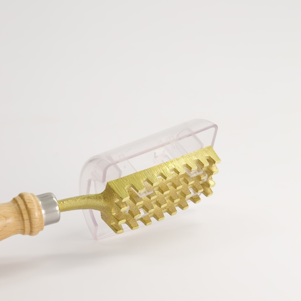 Messingen er slitesterk og korrosjonsbestandig, men har også en viss tyngde som gjør at redskapet ligger stabilt i hånden. Tennene er utformet med små mellomrom som gjør at skjellene samler seg på redskapet i stedet for å sprette rundt. Trehåndtaket gir et naturlig grep og er behagelig å holde i selv under lengre arbeidsøkter.