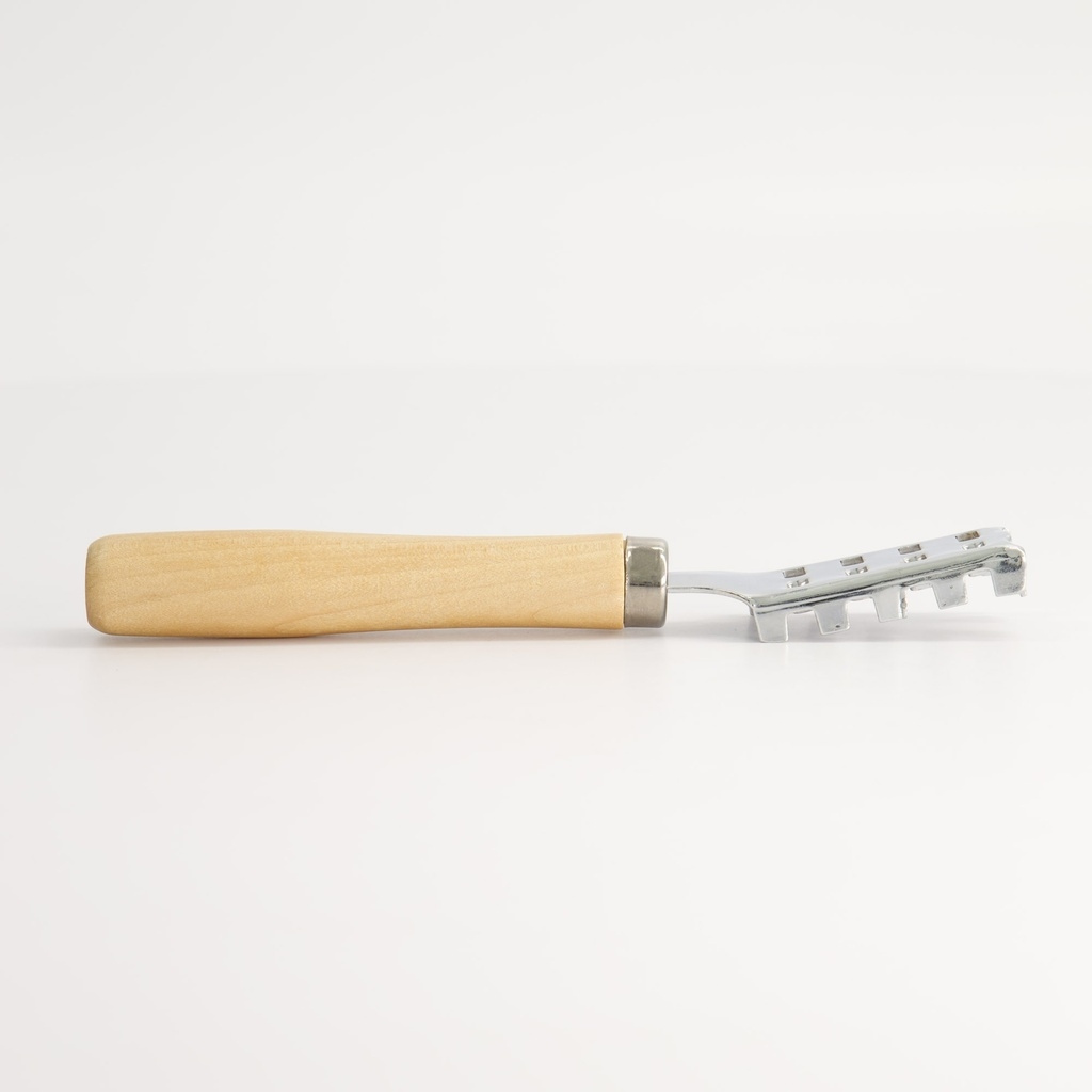 Å flå fisk er sjelden det morsomste på kjøkkenet, men det rette verktøyet gjør hele forskjellen. Fiskeskaleren er enkel, tung i forhold til størrelsen og konstruert for å fjerne skjell raskt uten å skade skinnet. De opphøyde kantene på hodet fanger opp skjellene og hindrer dem i å sprette av, noe som gjør jobben merkbart mindre grisete.
