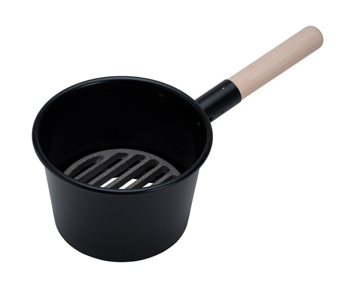 Trehåndtaket gjør det mulig å flytte pannen selv når den er varm, og den høye, rette veggprofilen holder glørne sammen samtidig som lufttilførselen gjennom åpningen kontrolleres på en naturlig måte.
