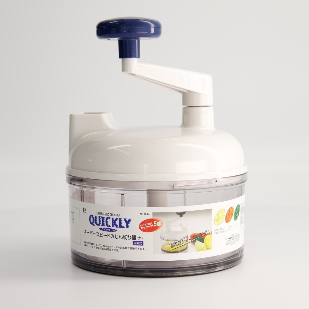 Den manuelle japanske grønnsakshakkeren, minihakkeren, er et kompakt og effektivt verktøy for rask hakking av grønnsaker, urter, nøtter eller hvitløk uten bruk av strøm. Med en veivdrevet mekanisme og skarpe, roterende kniver i rustfritt stål gir den jevne resultater og god kontroll over hakkestørrelsen - fra grov til veldig fin, avhengig av antall omdreininger.