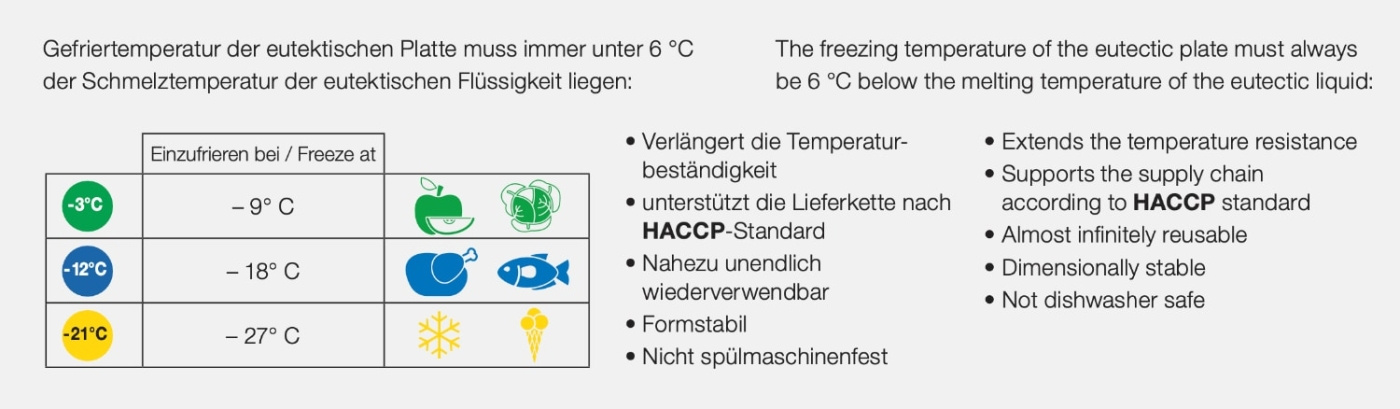 Kjøleblokker i polyetylen støpt i GN-mål for direkte bruk i Schneiders transportkasser. Fyllingen er formulert for å holde temperaturen ved -12°C, egnet for transport av dypt avkjølt tilberedt mat, fisk og skalldyr samt produkter som krever kjøling under frysepunktet uten å være dypfryst. For transport av ferskvarer og meieri er -3°C-varianten tilstrekkelig, mens dypfryste produkter som is og frossen kjøtt krever -21°C.