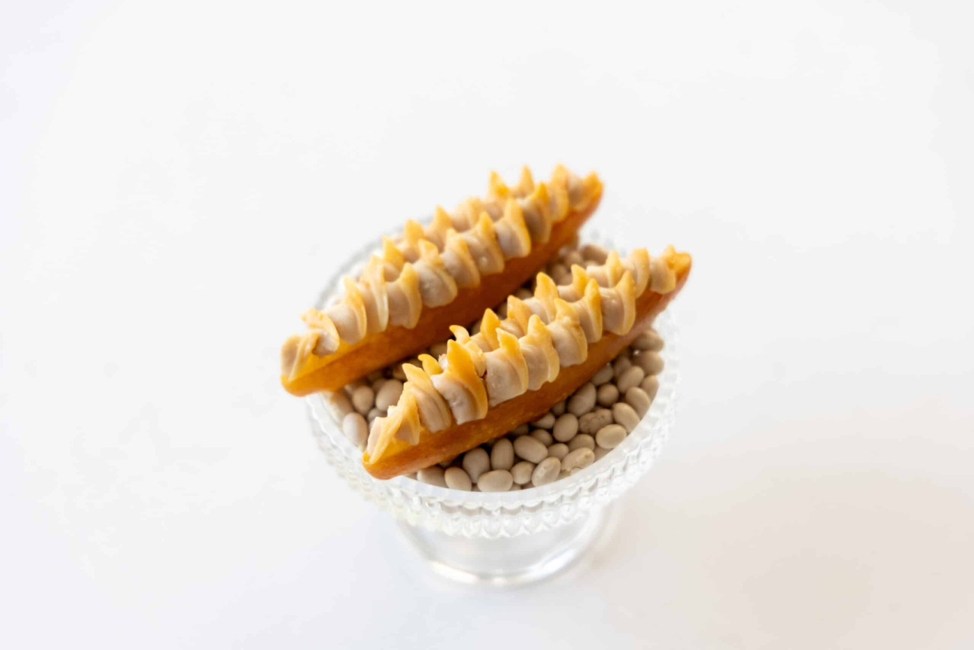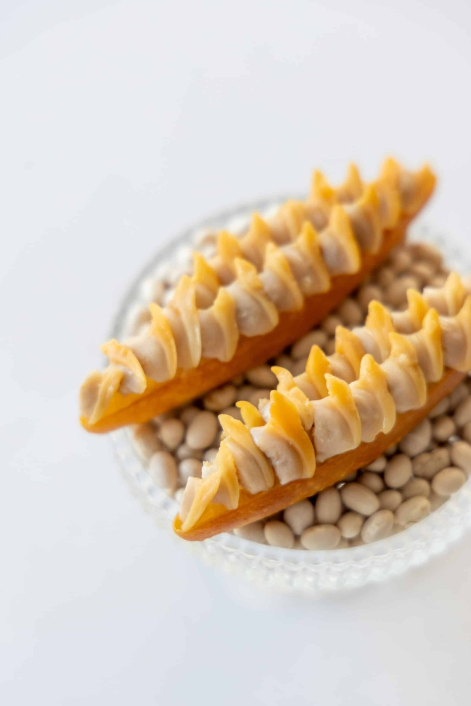 Det avlånga formatet handlar ikke bare om estetik, det styr aktivt hvordan man tänker kring plasseringen på tallerkenen. En droppformad krustad presenteras naturlig stående, lutad, eller i en komposisjon der formen kommuniserer riktning. Fyll den med en kall emulsion av brynt smør og fermenterad vit sparris og lägg den mot en tynn skiva råsyrad rotselleri. Eller en varm fylling av skogssvamp og enbär i en lätt gräddbindning, toppad med noen droppar lagrad äppelcidervinägir som skjærer igenom fettet. Till dessert: et sprøt skal med en slät kräm på rostad havre og et gelé på vild blåbär med en touch av granbarr, der bitterheten fra granbarret løfter det rostade uten att ta over.