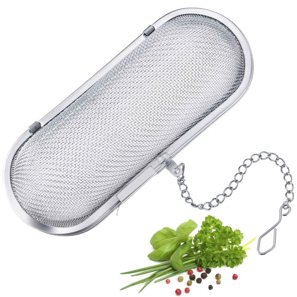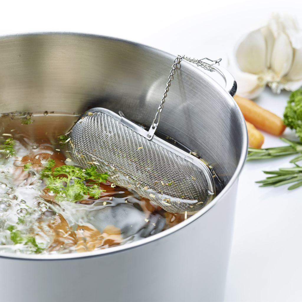 Med en lengde på ca. 11 cm lang og mer enn 4 cm i diameter har den ovale krydderbøtten den ideelle størrelsen for oppbevaring av krydder og urter under matlagingen, og den egner seg også godt til å lage te i en kanne av passende størrelse. Den kan enkelt fylles ved å åpne lokket og lukkes igjen takket være lukkemekanismen på siden. Den lange kjeden med integrert krok sørger for at silen ikke faller ned i gryten under kokingen. Den praktiske silen i rustfritt stål er ideell til både hjemme- og restaurantbruk. Den er smaksfri og kan enkelt rengjøres i oppvaskmaskinen etter bruk.