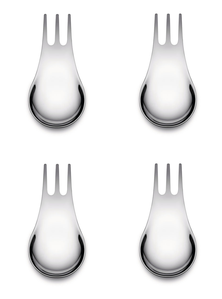 Moscardino er det lille bestikket med den store ideen: en hybrid mellom skje og gaffel, designet av Giulio Iacchetti og Matteo Ragni for Alessi. Her i en 4-pakning for mingling, plukking, tapas og småservering der det er behov for noe mer elegant enn engangsbestikk - men ikke fullt så formelt som klassisk bestikk. Laget av rustfritt stål med organiske linjer og et særpreget design som både skiller seg ut og fungerer. Perfekt til aperitiffer, snacks eller små desserter - spesielt hvis du ønsker å servere med stil uten oppstyr.
