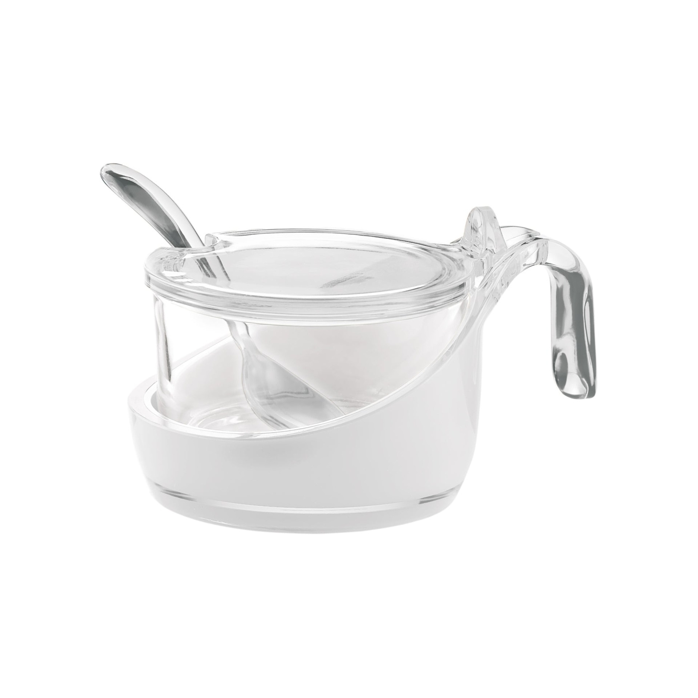 Skålen har en innerbeholder i glass og et lokk som enkelt åpnes med én hånd når det er tid for mer. Den medfølgende skjeen ligger alltid klar i lokket, noe som gjør serveringen praktisk både ved middagsbordet og til frokost eller kaffe.