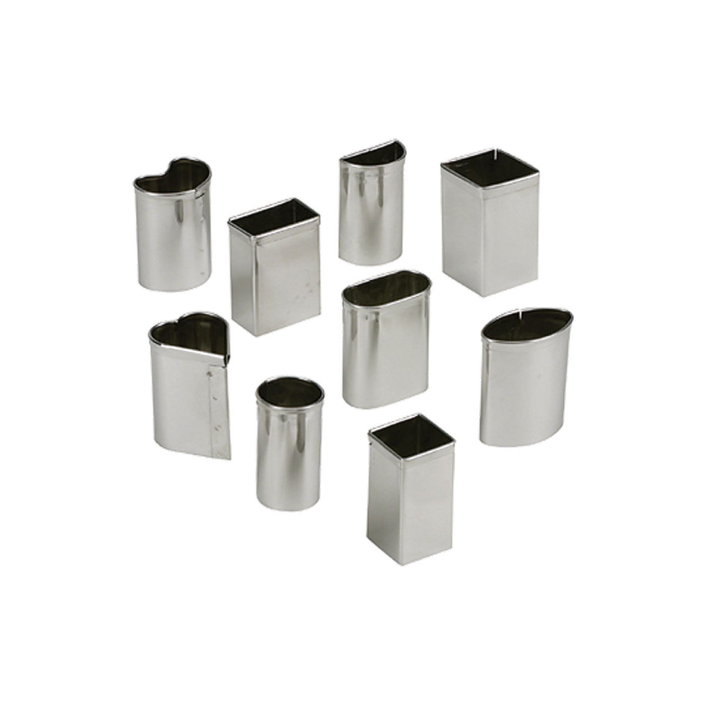Settet inneholder ni utstikkere i rustfritt stål i ni klassiske petit fours-former: bue, kurve, diamant, hjerte, oval, rund oval, rund, rektangel og kvadrat. Formvariasjonene dekker det tradisjonelle petit fours-sortimentet og muliggjør konsistent formgivning uten å bytte verktøysett.