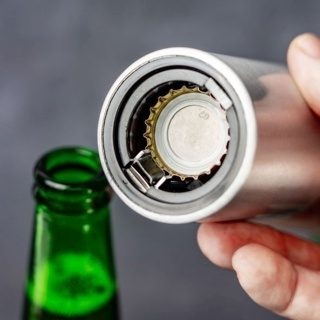 - automatisk kapselåpner med fjærbelastet åpningssystem - åpner flasken ved en enkel nedadgående bevegelse gjennom en fjærbelastet mekanisme - takket være en magnet fester kronkorken seg deretter til åpneren og kan fjernes målrettet