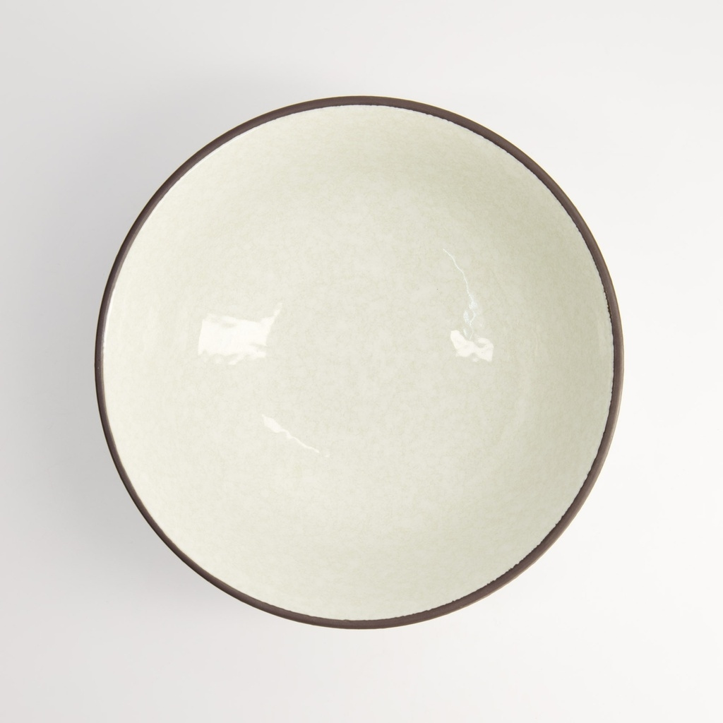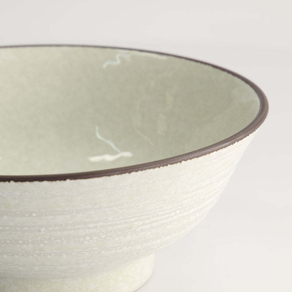 Hime Kobiki ramenbolle er laget av japansk steintøy og kombinerer eleganse med funksjon. Den lyse, nesten perlemorsaktige glasuren og den tynne, mørke kanten gir bollen en tidløs estetikk som fremhever fargene til ramen, soba eller udon.