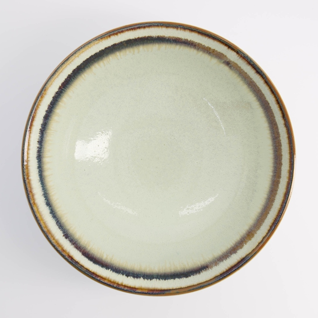 Denne ramen-bollen, Wasabi, har en myk grønn glasur som skifter i tone fra lys jade til dypere oliven med subtile hint av brunt og blått langs kanten. Glasureffekten, som japanerne kaller yūhen, gir hver skål et unikt uttrykk, som om fargen beveger seg levende over overflaten.