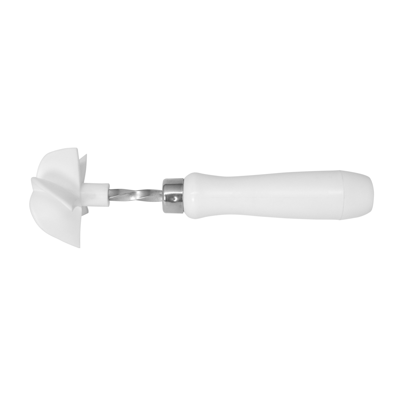 Håndstempel med håndtak i polypropen og stempelhodet i polyeten. Brukes til å stemple rundstykker med rosenmønster. Stempelets diameter er 64 mm, tilpasset standardstørrelse for rundstykker på ca. 50-70 gram deigvekt. Verktøyet presses mot det avrundede deigstykket og gir det karakteristiske mønsteret som deler overflaten inn i fem segmenter.