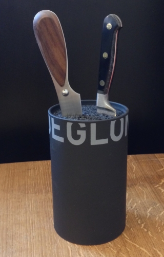 "Lite og praktisk knivstativ fra franske Déglon. Selv om stativet er lite i størrelse, kan det romme mange kniver, takket være at det i stedet for å ha faste rom (som mange andre knivstativer har) har et indre av plaststrå som gjør at knivene kan plasseres i knivstativet akkurat slik du vil ha dem.