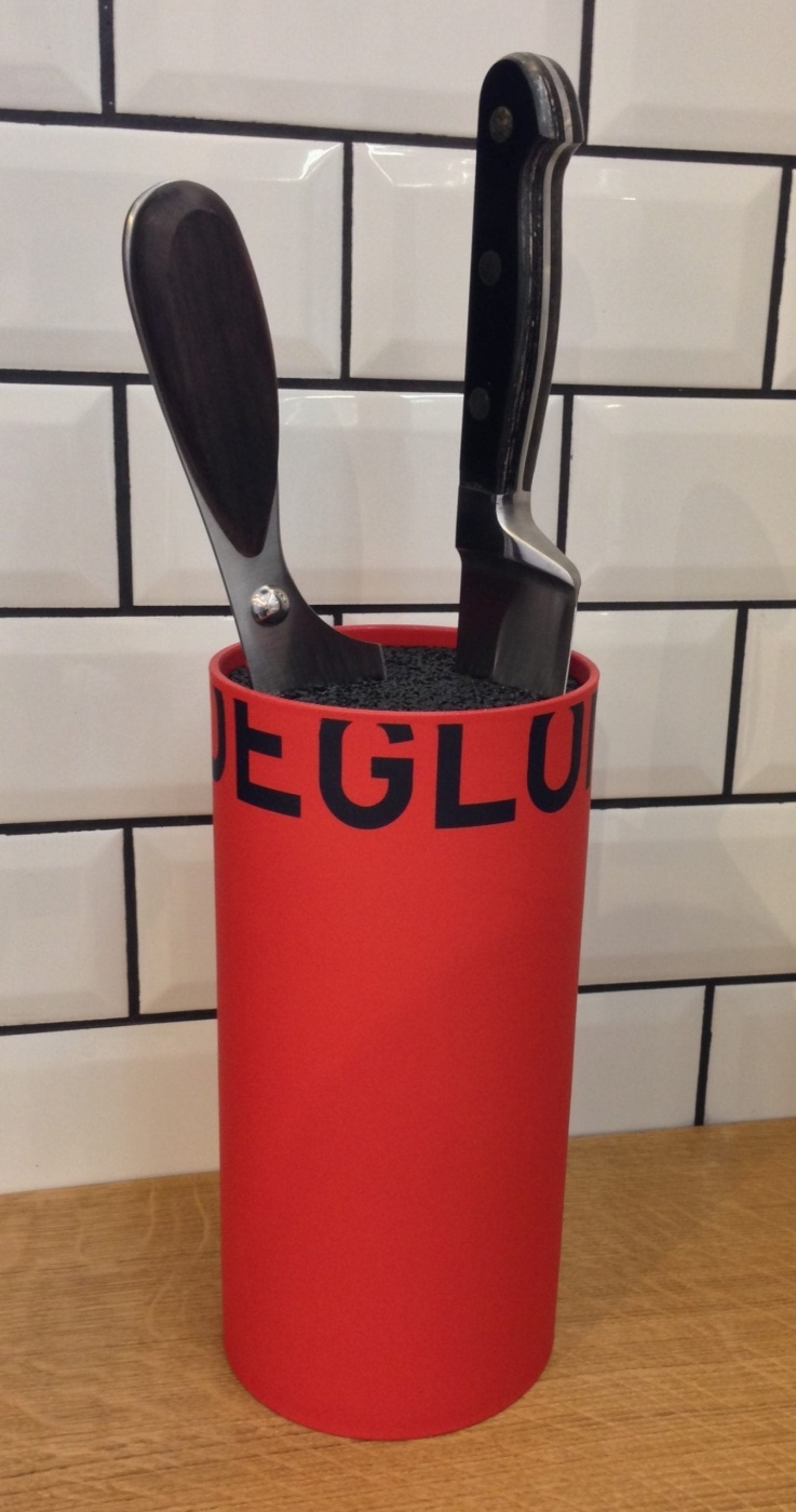 "Lite og praktisk knivstativ fra franske Déglon. Selv om stativet er lite i størrelse, kan det romme mange kniver, takket være at det i stedet for å ha faste rom (som mange andre knivstativer har) har et indre av plaststrå som gjør at knivene kan plasseres i knivstativet akkurat slik du vil ha dem.
