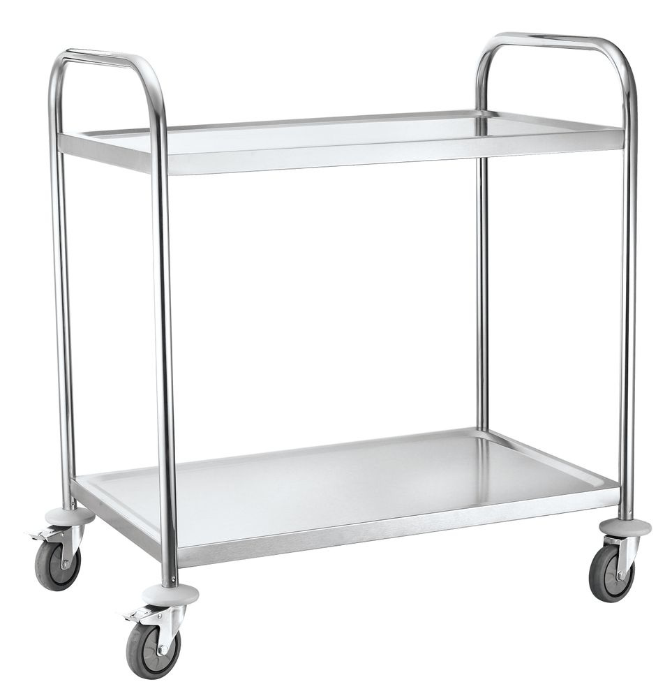 Serveringsvogn i rustfritt stål med to hylleplaner og dempningsmateriale under hvert plan som reduserer støy fra tallerkener og kar. Maks. last 50 kg per hylle. Arbeidsflaten måler 830×510 mm og avstanden mellom hylleplanene er 550 mm, noe som gir god høyde for å stable tallerkener eller romme høyere gjenstander på underhyllen.