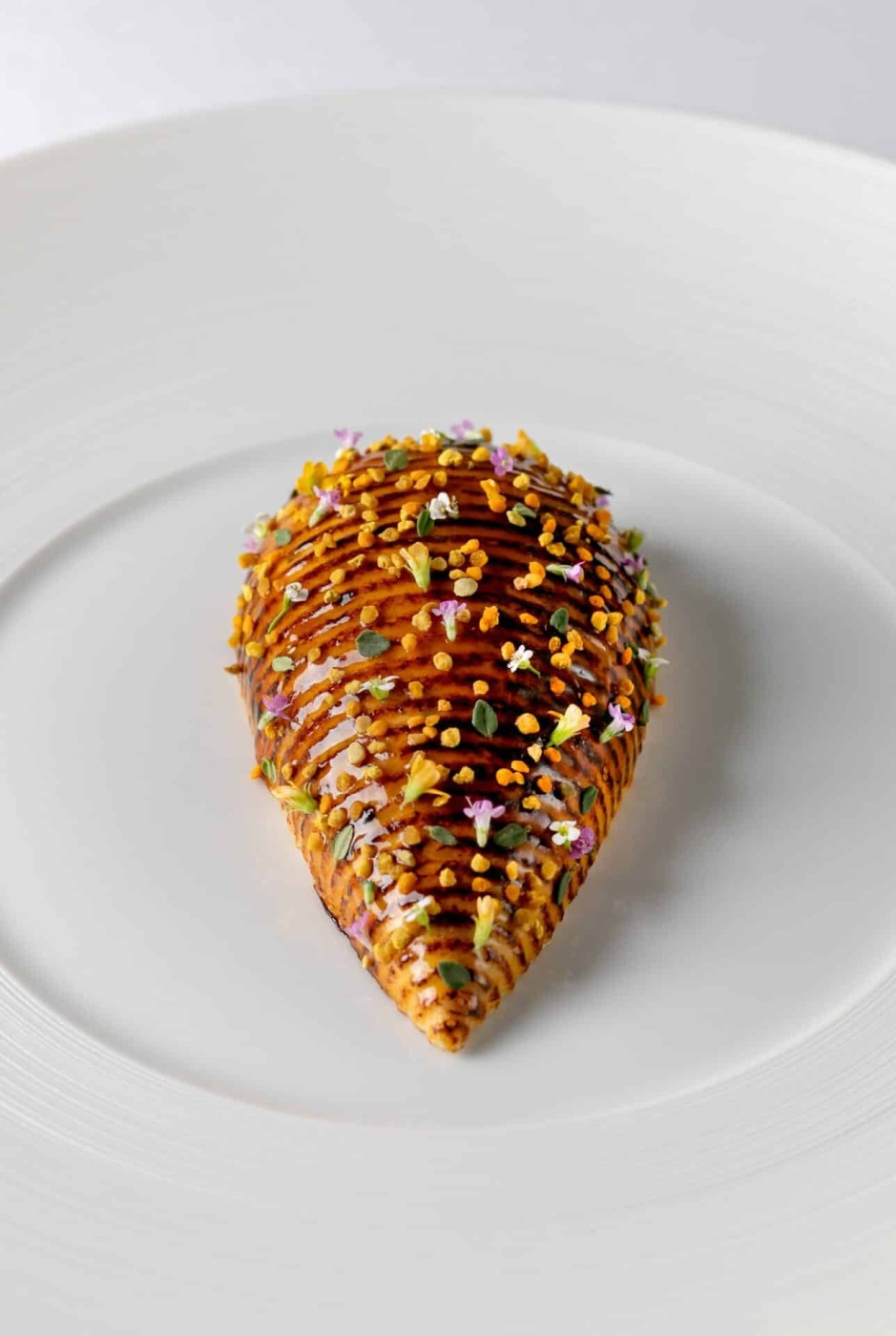Vad som ryms inuti styr rettens dramatik ved bordet: et floverflatende inre av chasseursås med svamp og tryffelolja som rinner ut når retten delas, et fast block av rökt ankfond satt med gelatin, eller et kylt inslag av blomkålscrème og enbär som kontrasterar mot det varma yttre. Interiörformen er konstruerad som et komplement til Alex Dilling-formarna i sortimentet.