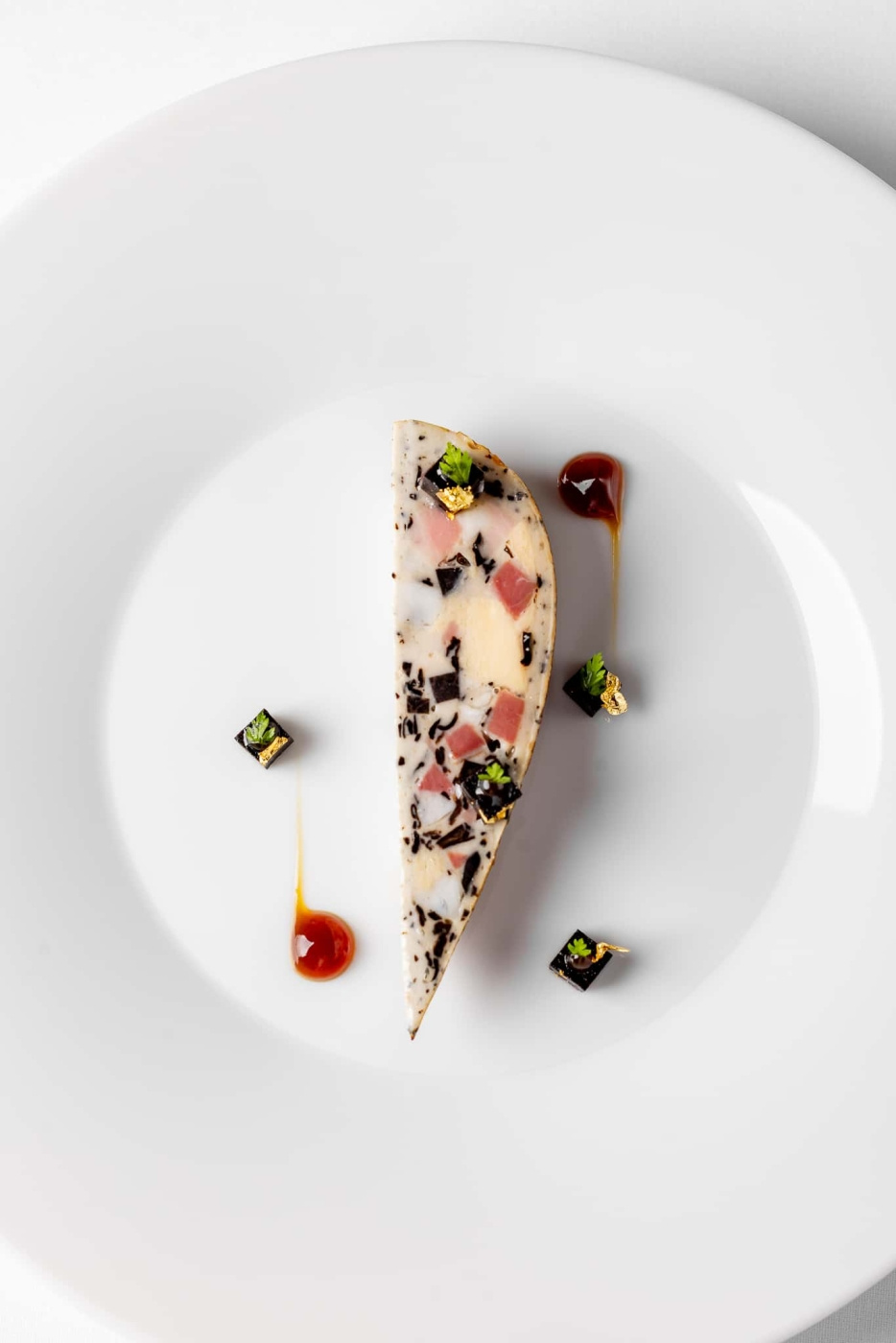 Forestière-traditionen bærer med seg skogens råvaror: svamp, örter, markens djupa karakter. I Dillings tolkning skruvas det upp med svart tryffel og rökt ankbröst, komprimerat til en porsjonsberedning med droppformens naturlige riktning på tallerkenen. Interiörformen, tilgjengelig separat, skaper et dolt inre element for ytterligare et lagir dramatik ved anrättning.