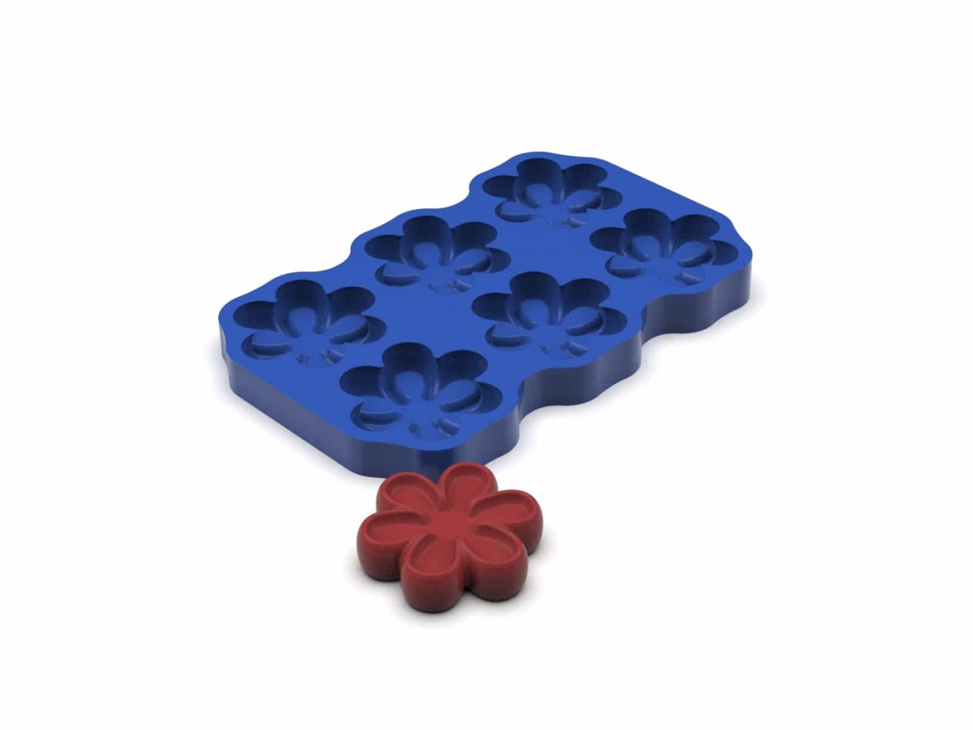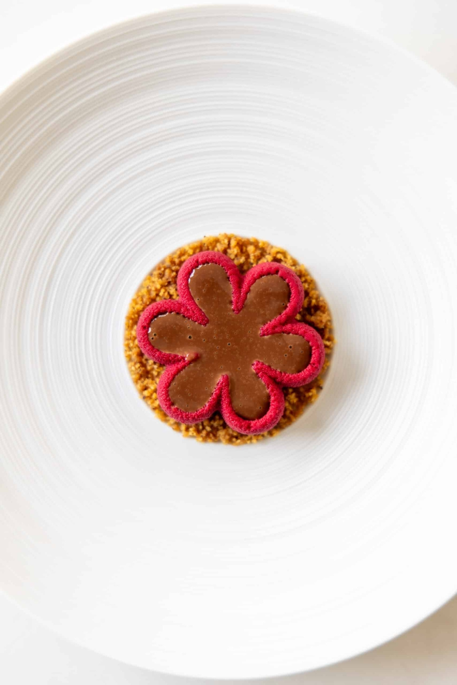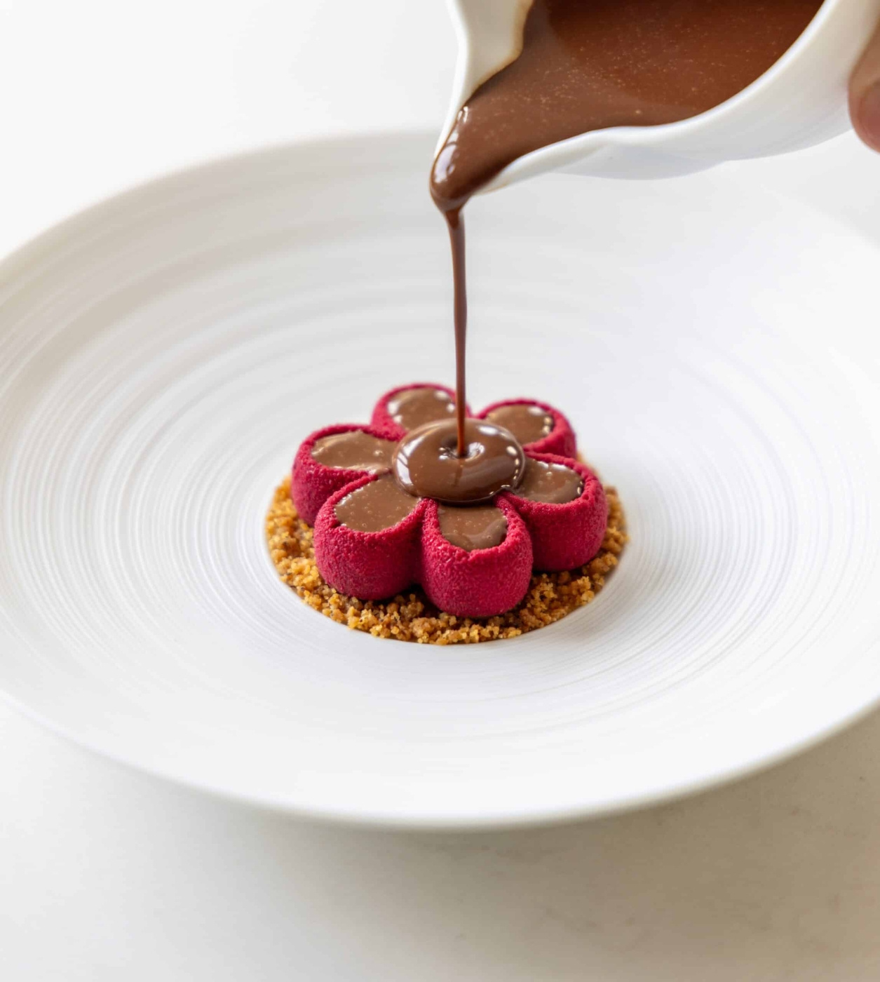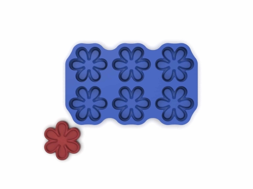 De yttre spetsarna er den tunnaste punkten i hver porsjon og skaper en naturlig teksturgradering fra kant til centrum. Det gir formen et inbyggt dramaturgiskt förlopp: spissen er alltid det første som skjer. En mousse av mörk choklad med havtornsgelé i centrum, en vit chokladparfait med en kärna av karamelliserad äppelkräm, en kallsatt rödbets- og getostmousse med valnötsolja i fördjupningen, eller en rökt laxfarce med syrad crème fraîche og löjrom. Formen er i 100% matgodkjent silikon.