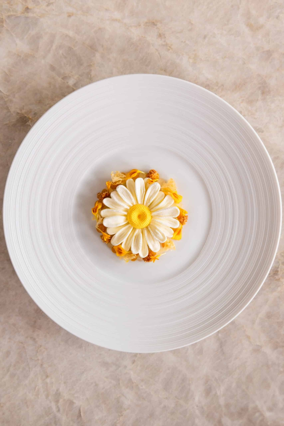 En vaniljcrémeux i kronbladen mot et citrongelé med gurkmeja i centrumet speglar blomman direkte. En vit chokladpannacotta med en kärna av passionsfrukt og mejram, eller en blomkålscrème i kronbladen med saffransgelé i centrumet til en kall skaldjursrätt. Det djupa centrumet rymmer dessuten et floverflatende element: en varm buljong av libbsticka med citron som rinner ut når gästen bryter blomman ved bordet.