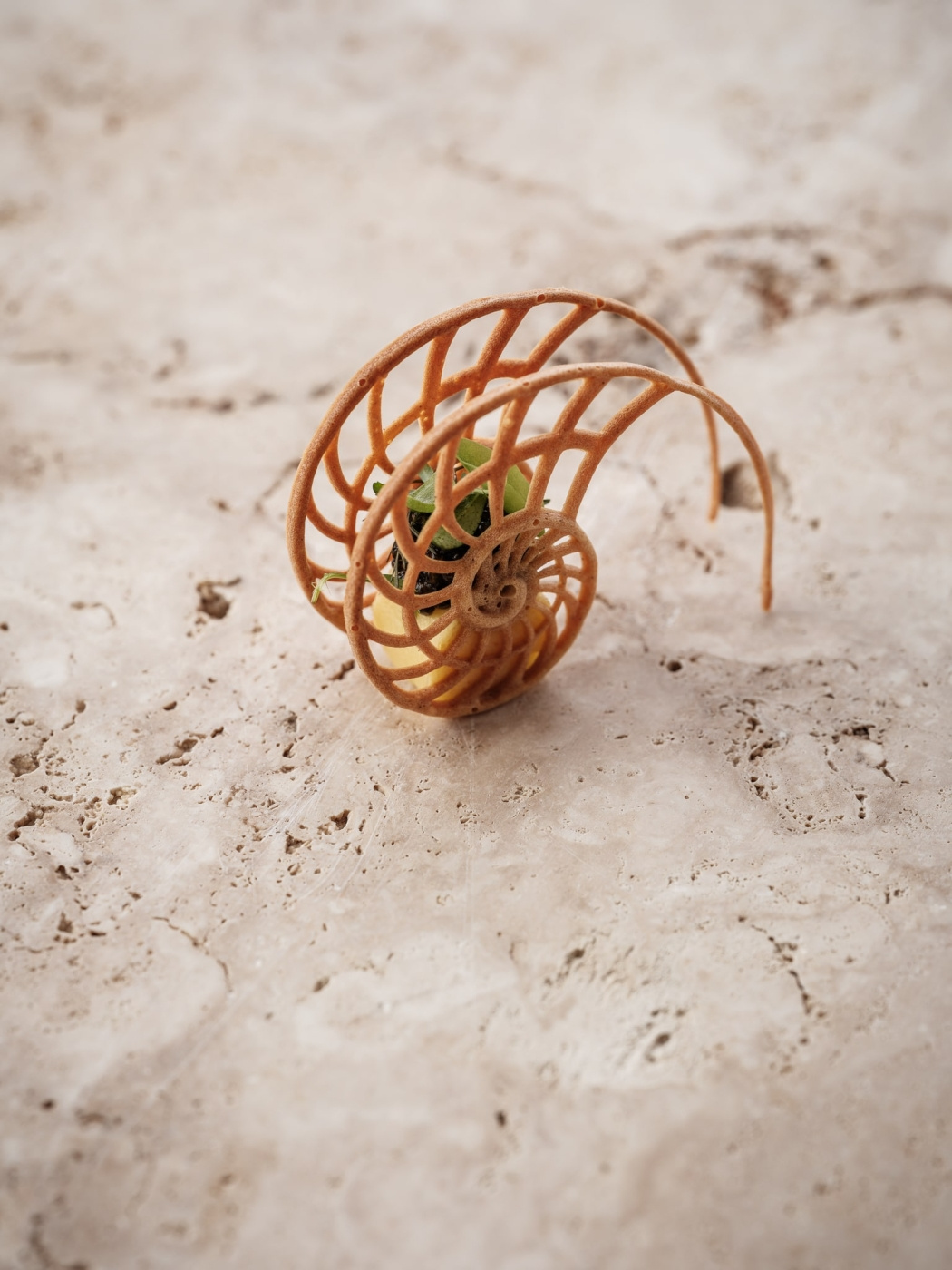 Tuilen bakt i formen gir et lettt, sprøt skal med spiralens eksakta räfflor og symmetriska kurva bevarade i hver steking. Det er en form som kommuniserer innan den smakas: gästen läser havet, matematiken og håndverket i samme ögonblick.
