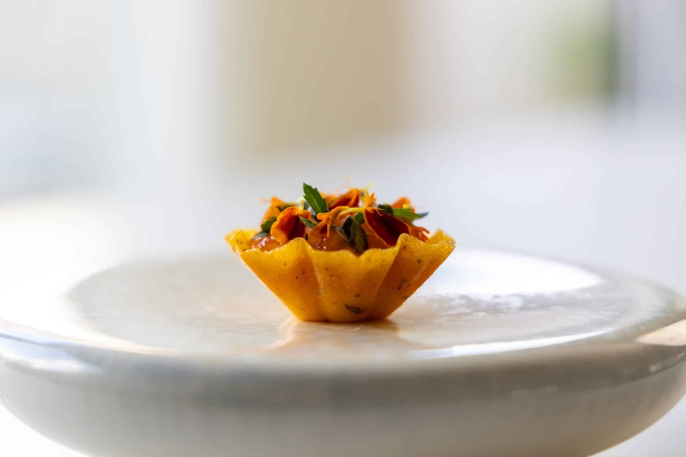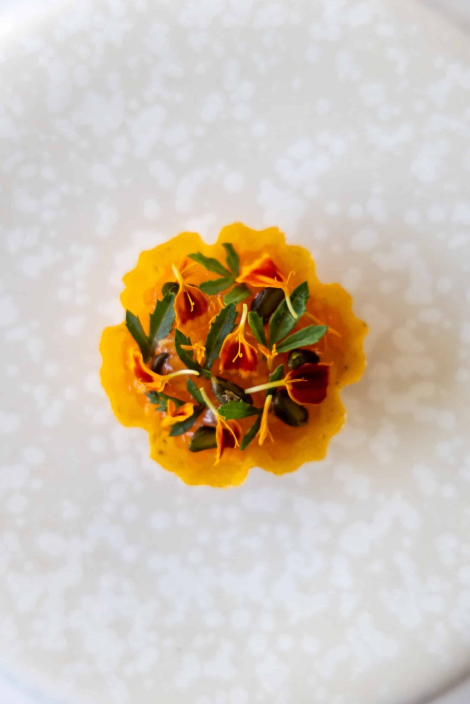 Det som avgjør resultatet er hvordan degen följer expansionen. Den måste vara tynn nog att lägga seg i hver kronblad uten att tappa definition, men samtidigt tillräckligt stabil for att bære upp den öppnande strukturen ved bakning. Kavla jämnt, presse nøye fra centrum og utåt og baka under tryck for att fixera formen. Resultatet er en tartelette som ikke bare bærer fylling uten också riktar den, fra kärna til spiss.