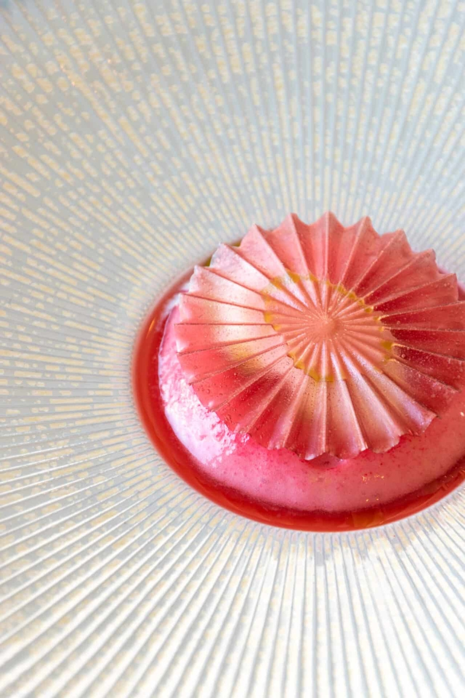 Det ribbade mønsterets parallella spår er ikke bare estetik. De samlar kontrasterande element og framhäver dem: et pudrat lagir av frystorkat bærer, et stänk av lakritsolja eller et tunt flyt av smält fett som stelnar i spåren og bildar et geometriskt smakavtryck. Massan du velger styr karakteren helt, tuile av havre og brynt smør, fruktläder av aronia og timjan, isomalt tonat med lingonkoncentrat, eller råg- og linfrödeg dehydratiserad til et sprøt kjeks til fermenterat smør og rimmad lax.