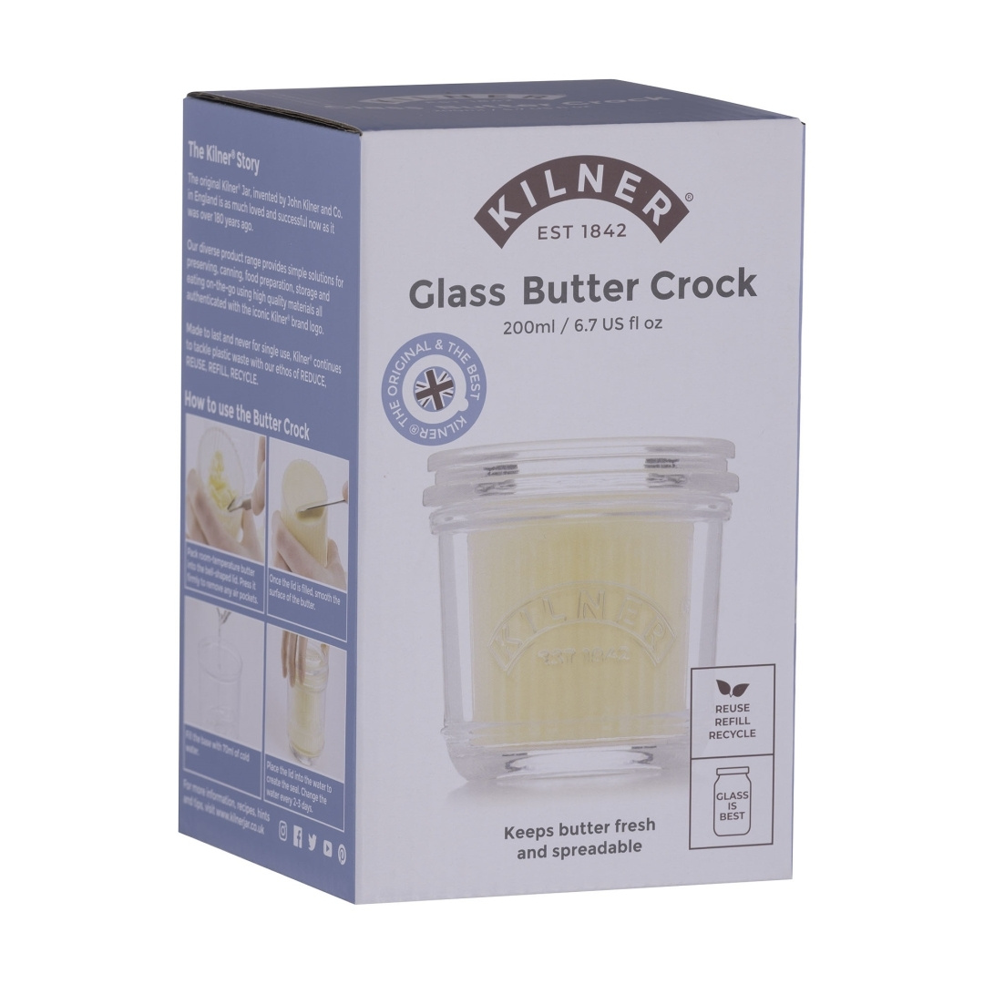 Smørskål i glass fra Kilner er et stilrent og funksjonelt oppbevaringskar som gir et klassisk og tidløst uttrykk på kjøkkenet. Det gjennomsiktige glasset viser smøret på en elegant måte og skaper en følelse av hjemlighet og ekte håndverk. Det tettsluttende rommet bidrar til å bevare både smak og aroma, samtidig som smøret holder seg friskt lenger. Formen og størrelsen gjør den enkel å plassere på bordet eller i kjøleskapet, klar til bruk når det er tid for brød, frokost eller middag. Den robuste konstruksjonen gjør at den tåler daglig bruk uten å miste sin sjarm og stil. En Kilner-smørklokke er ikke bare et praktisk tilskudd til kjøkkenet, men også en detalj som bidrar til en vakrere borddekking og en mer innbydende følelse rundt måltidene.