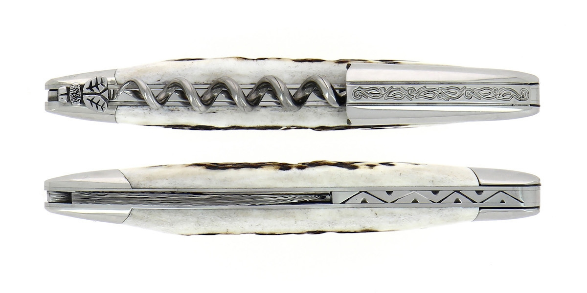 Sommelierkniv av hjortegevir, damascenert med dekor, Collection - Forge de Laguiole