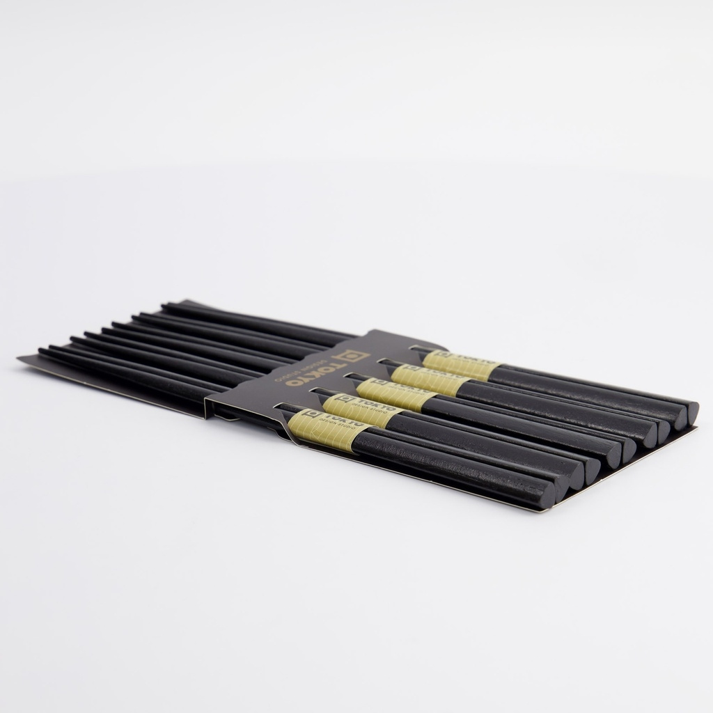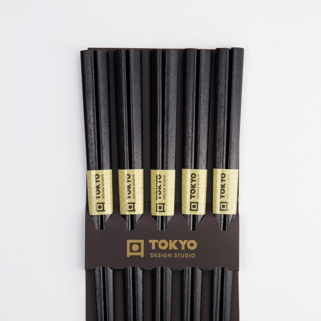 Et elegant sett med fem par svarte spisepinner i tre fra Tokyo Design Studio, laget med en matt overflate som gir et naturlig grep og en taktil følelse. Overflaten er litt ru, noe som gjør spisepinnene behagelige å holde i og gir ekstra kontroll når du skal plukke ris, nudler og småretter.