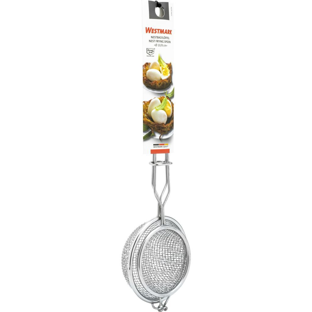 Med den høykvalitets reirstekeskjeen kan du lage sprø kurver med poteter, squash eller gulrøtter. For å gjøre dette, fyller du det store dørslaget med syltynne potet- eller grønnsaksstrimler, fester det lille dørslaget over med en krok og friterer det i olje. De deilige reirene vil garantert gjøre seg godt som forretter på neste fest!