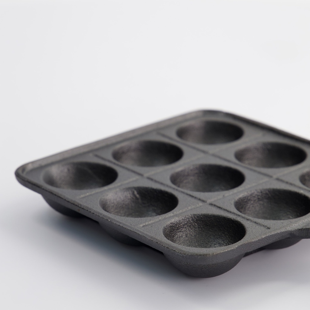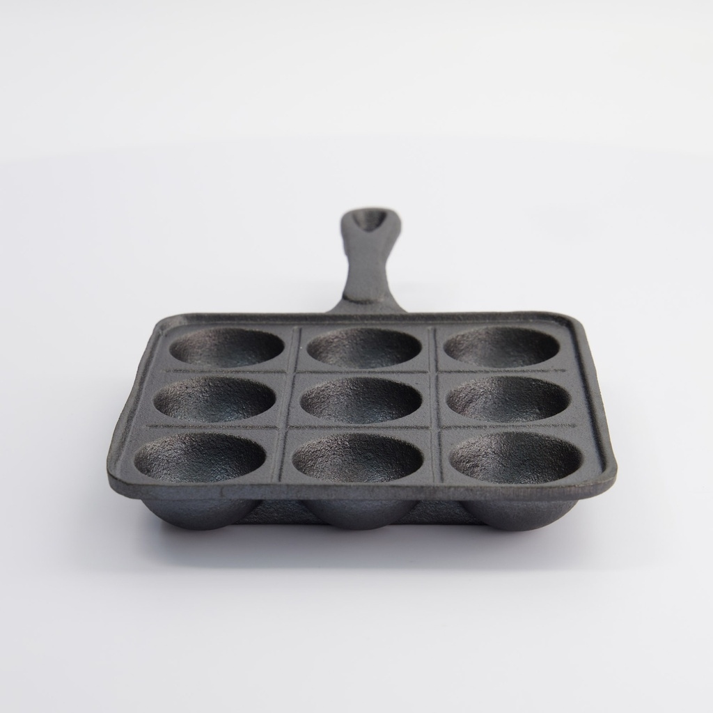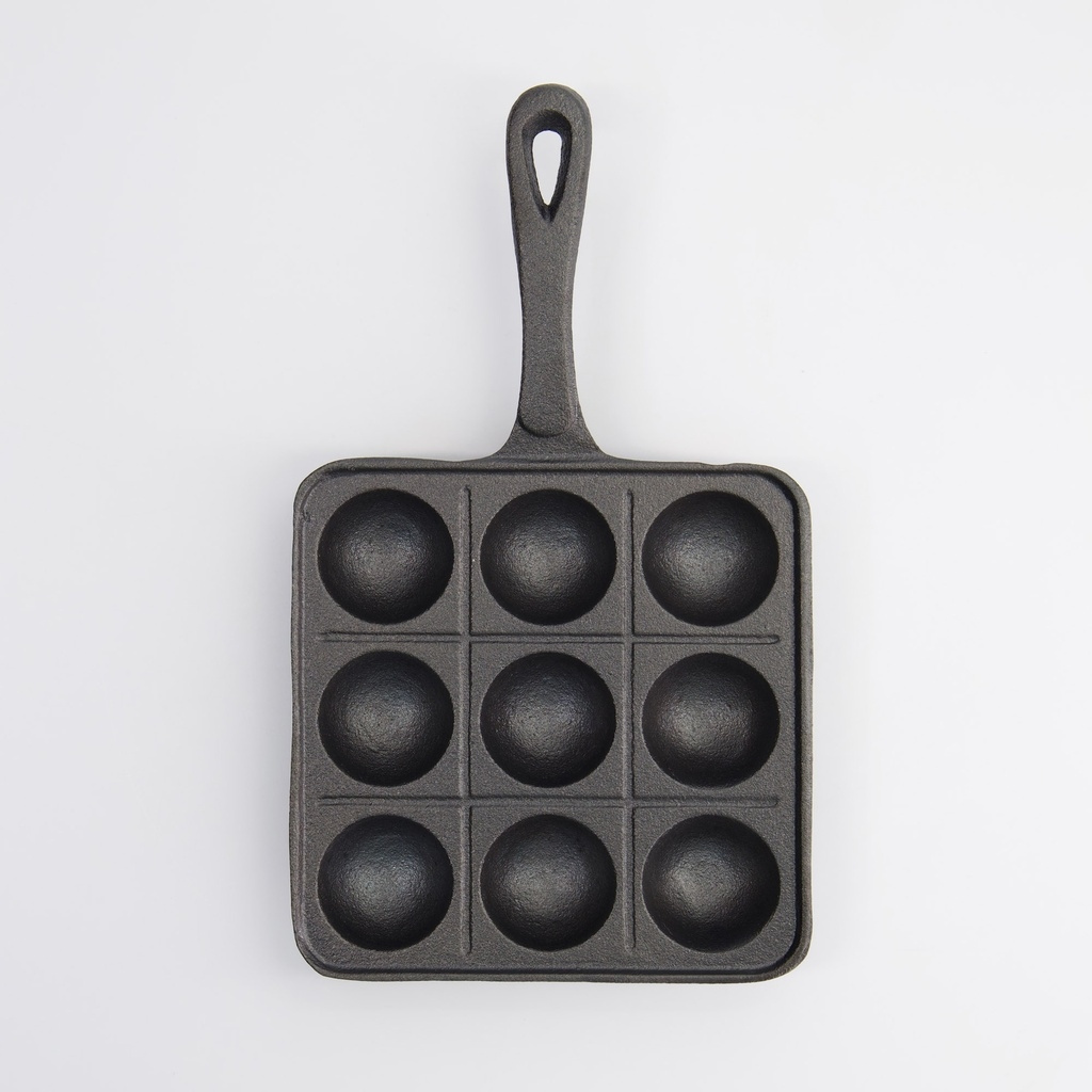 Pannen er laget av varmelagrende støpejern, noe som gir en jevn stekeoverflate i hver fordypning. Formen med ni kopper har en sjenerøs dybde som gjør det enkelt å lage perfekt runde kuler. Støpejernet tåler høy varme, noe som er viktig når du ønsker å få den tynne, sprø overflaten samtidig som innsiden er myk. Håndtaket er integrert i støpejernet for maksimal stabilitet og lang levetid.