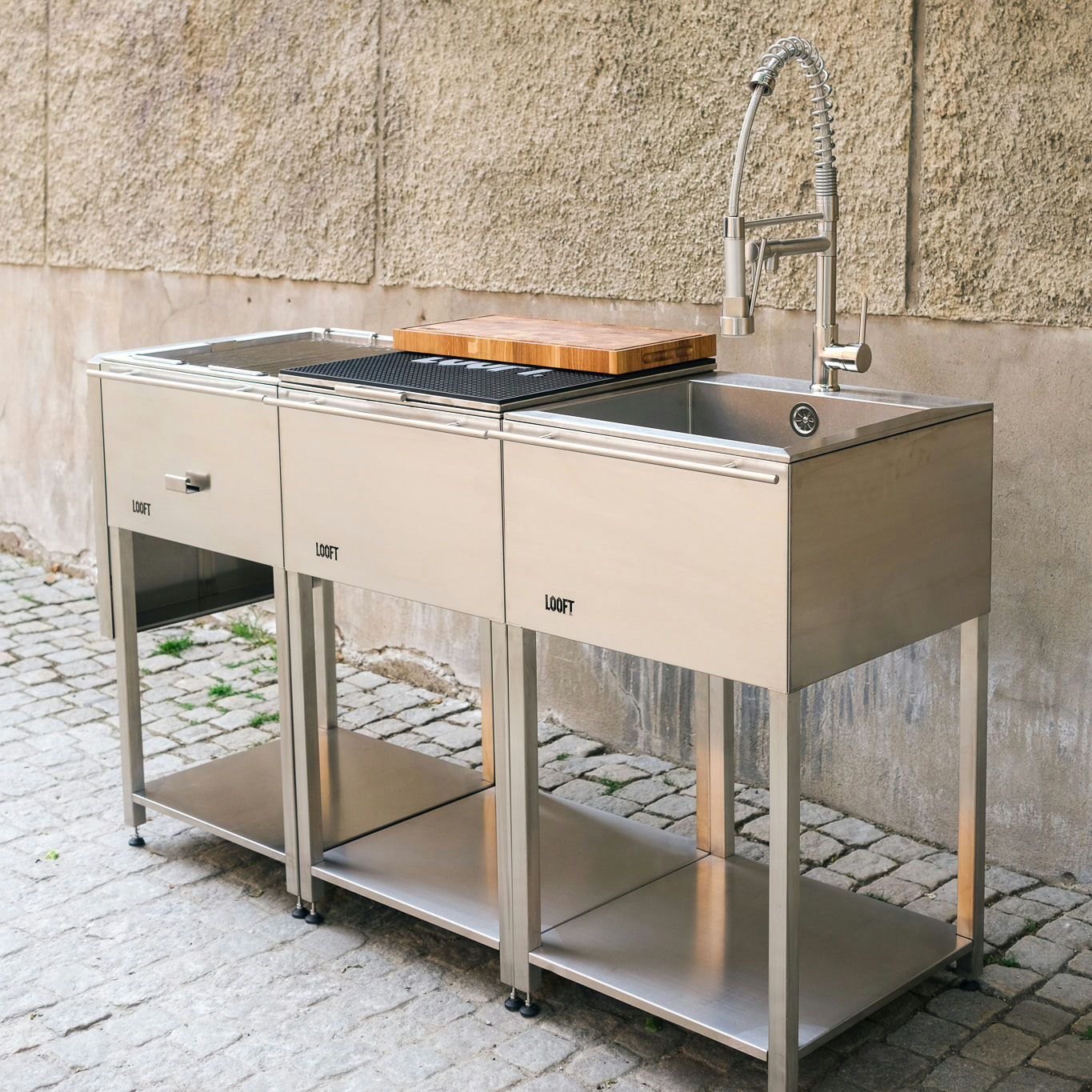 Dette er en komplett og praktisk løsning for utendørs matlaging. Den inkluderer Loofts høykvalitets kullgrill, en arbeidsbenk i rustfritt stål og en vask med kran – perfekt for enkel matlaging og rengjøring. Det stilrene designet gjør den både funksjonell og holdbar – ideell for utendørs sammenkomster.