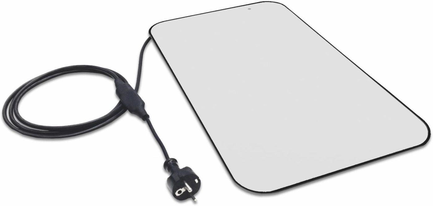 Temperaturbestandig opp til 120°C og sprut beskyttet. Mål: 480×280×10 mm, vekt 1,2 kg. Tilkobling 230 V.